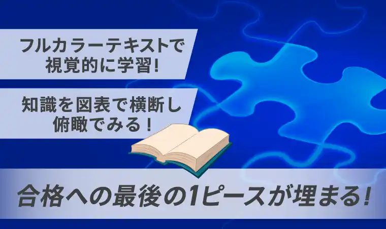 本カリキュラムでは、既に何度も知識のインプットを行ってきた上級者向けに、「図表まとめ講座」を用意しています。 一般的な教科書とは違い、図や表のみで構成された教材で、合格への「最後の1ピース」を埋めることができます。 今までの学習でインプットしてきた知識を、視覚的かつ横断的に整理をすることで、不完全な知識や過去問の丸覚えになってしまっている知識が無いように仕上げることが可能です。 演習に取り組む前のおさらいとしてはもちろん、試験直前期の総まとめ教材としても役立ちます! |