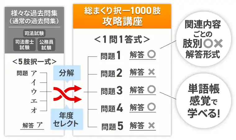 本カリキュラムでは、通常の過去問集だけでなく、様々な試験の過去問を選択肢ごとにバラして、1問1答形式にした「総まくり択一1000肢攻略講座」を用意しています。 講師が長年の受験指導のなかで培った経験をもとに、出題が予想される分野を網羅的に1000肢ピックアップしています。 実際の過去問形式だと見逃されてしまった理解が不完全な選択肢もしっかりと潰すことができるので、過去問を一通り解き終わった方の演習ドリルとして最適です。 別角度からの過去問演習で、過去問の理解度を高レベルまで引き上げることができます。 |