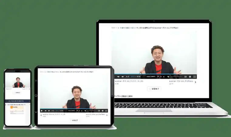 インターネット環境があれば、いつでも、どこでも、パソコン・タブレット・スマートフォン等で、マイページから講義を受講することができます。画面にはテキストが同時表示されるので、テキストを持ち歩く必要がありません。 また、9段階の倍速再生・進捗率等の便利機能があるため、学習環境に合わせた柔軟な受講が可能です。 さらに、オンライン上でテキストが見られるデジタルブック機能を搭載!閲覧はもちろん、書き込みやふせん機能も付属しているため、デジタルにて学習が完結します。 |