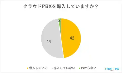 導入していると回答した42件のうち、最も多く利用されていたのは当社の「MOT/TEL(モッテル)」で、全体の54%を占めました。 次いで「クラコールPBX」「トビラフォン Cloud」「03plus」「ナイセンクラウド」などの利用も見られました。 |