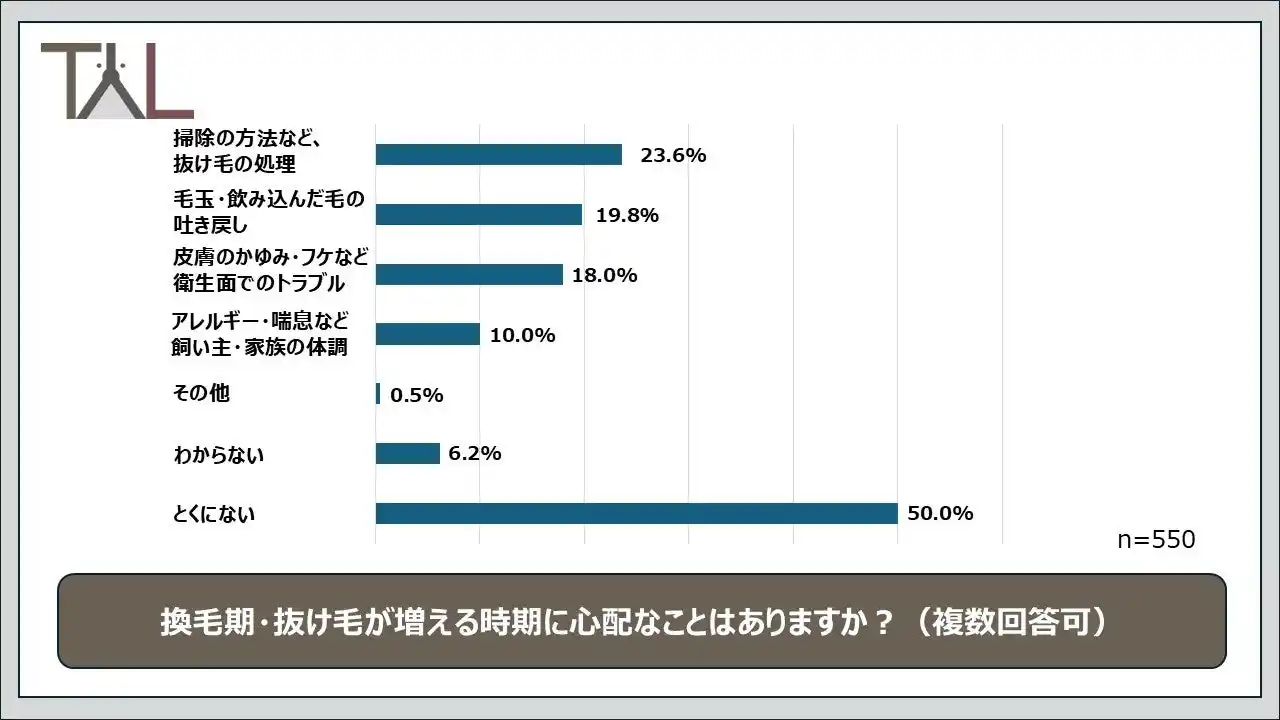| ペットの飼い主550名に対し「換毛期・抜け毛が増える時期に心配なことはありますか?」と質問したところ、50%の飼い主が「とくにない」と回答しました。一方、心配事としてもっとも多かったのは「掃除の方法など、抜け毛の処理(23.6%)」。トピックス1と同様に、抜け毛に対する心配事が多くなる結果でした。それ以外の回答は「毛玉・飲み込んだ毛の吐き戻し(19.8%)」「皮膚のかゆみ・フケなど衛生面でのトラブル(18.0%)」「アレルギー・喘息など飼い主・家族の体調(10.0%)」となり、一定数換毛期における心配事が発生していることがうかがえました。 | |||