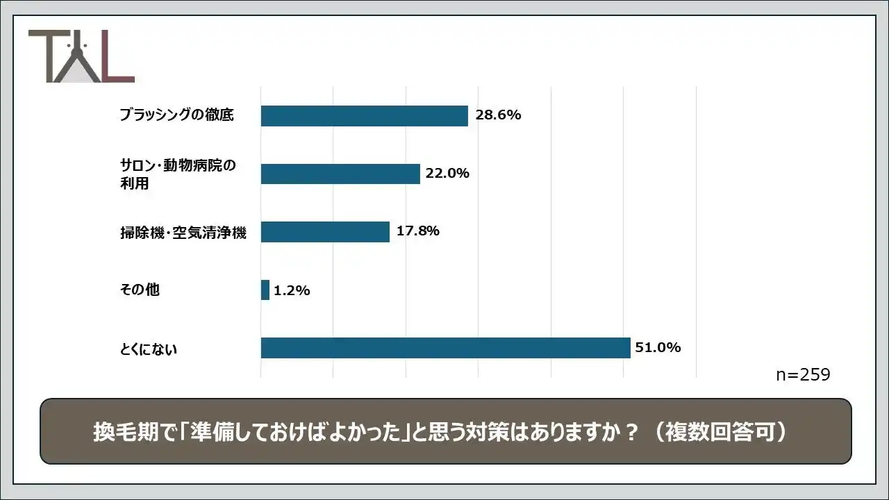 | 換毛期に何らかの対策をおこなっていると回答したペットの飼い主259名に「換毛期で『準備しておけばよかった』と思う対策はありますか?」と質問したところ、28.6%の飼い主が「ブラッシングの徹底」と回答しました。それについで、22.0%の飼い主は「サロン・動物病院の利用」と回答しており、ここでもブラッシングを飼い主が重視している傾向が分かります。 | |||