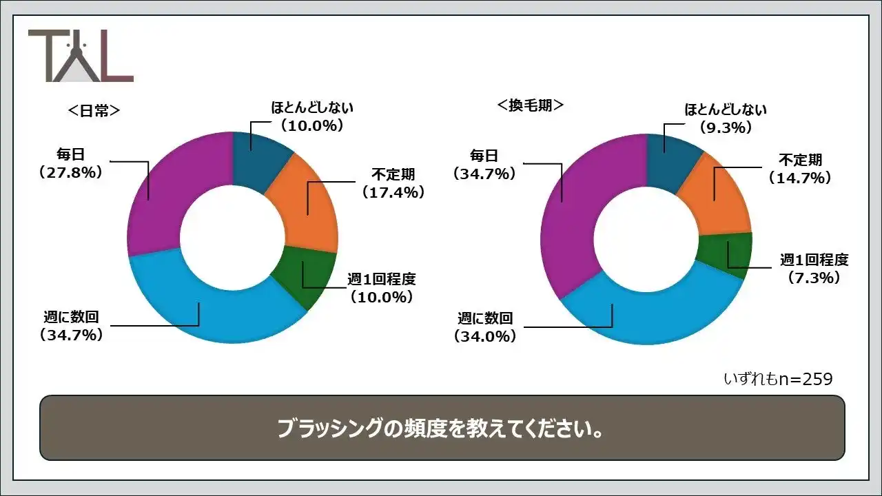 | 実際、換毛期に何らかの対策をおこなっている飼い主259名に「ブラッシングの頻度を教えてください」と質問したところ、通常でも「毎日」と回答した飼い主が27.8%、換毛期には34.7%という回答がありました。もっとも多かった回答は「週に数回」で、日常で34.7%、換毛期では34.0%という結果となり、「手ごろである」「効果が実感できる」という2点を満たす手段としてもブラッシングが選ばれていることがわかります。 | |||