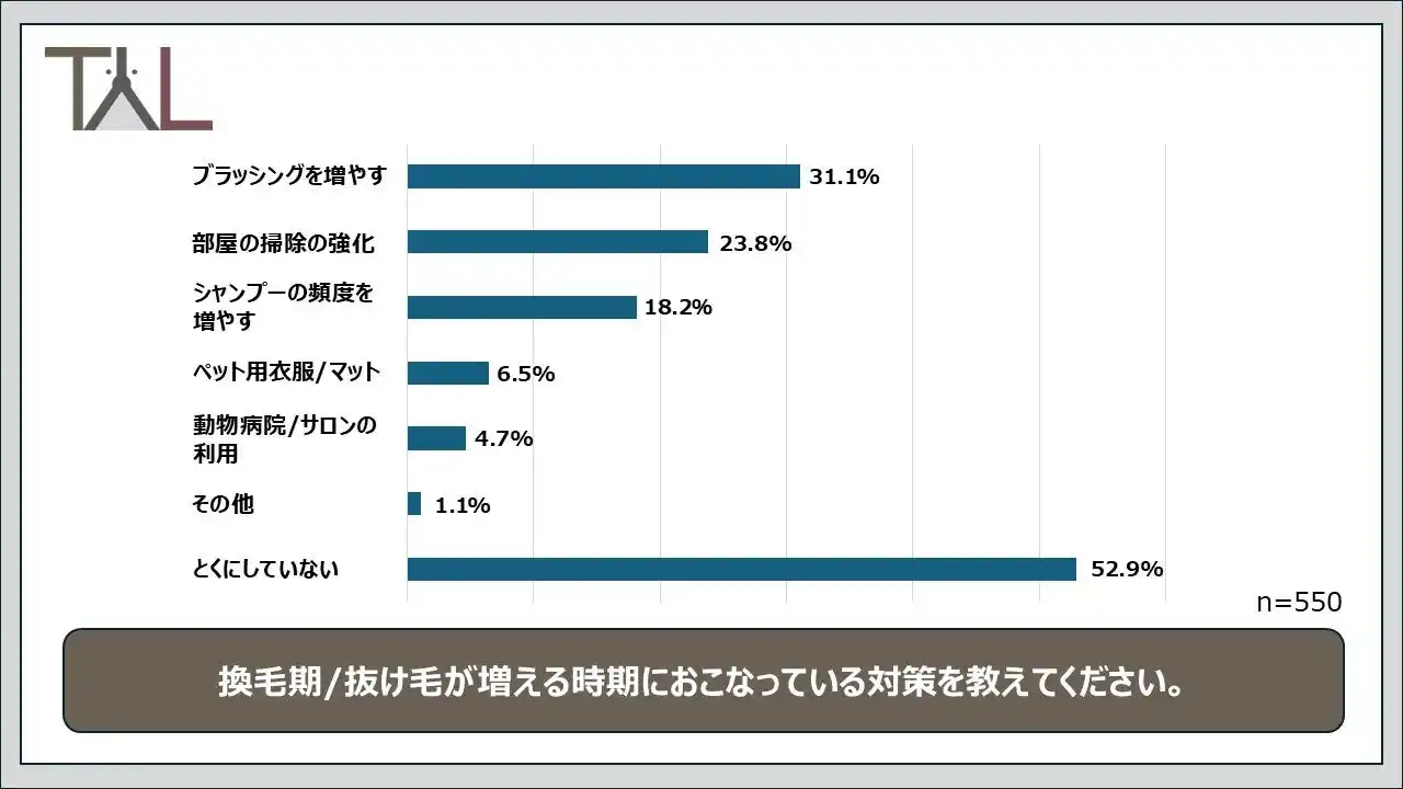 | TYLでは、ペットが健康に暮らせる環境をつくり、ペットと飼い主ともに「幸せな生活」を送れるように「ペットの医療DX」を進めており、首都圏にて5店舗の動物病院の運営および往診サービスを提供しております。今回の調査は、春・秋に多くのペットに訪れる「換毛期」の悩みごとや、対策について調査しました。ペットも飼い主も、お互いに健康で幸せな暮らしができることを願っております。 | |||