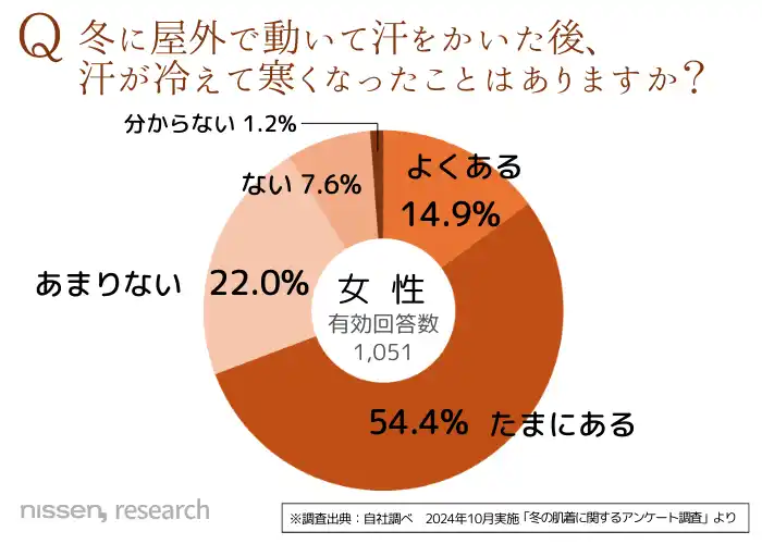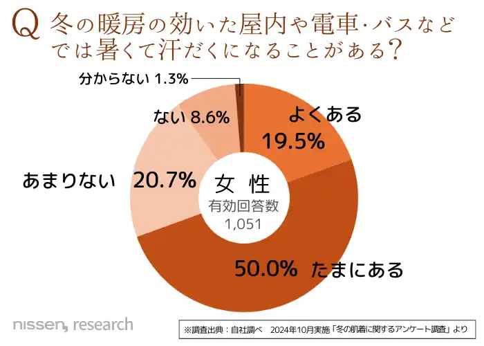 さらに2024年に実施した「機能性肌着」に関するアンケートでは、女性の約7割が「冬に暖房のきいた室内で汗をかく」「汗が冷えて寒くなる」経験があると回答。 |