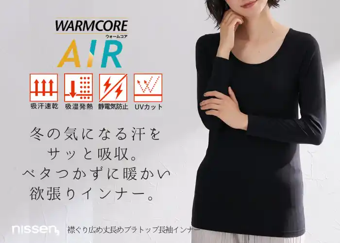 株式会社ニッセン(本社:京都市南区、代表取締役社長:羽渕淳)が展開する、あったかインナー『WARMCORE(ウォームコア)』シリーズにおいて、発熱しながら汗を素早く吸収・発散する『WARMCORE AIR(ウォームコアエアー)』にブラトップタイプの新作が登場しました。