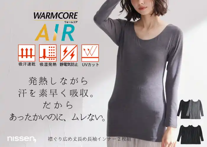 『WARMCORE AIR』は、「暖かいのにムレにくい」を追求した機能性インナーです。発熱しながら汗を素早く吸収・発散することで、寒暖差のある冬の日も、一日中さらりと快適に過ごせます。 |