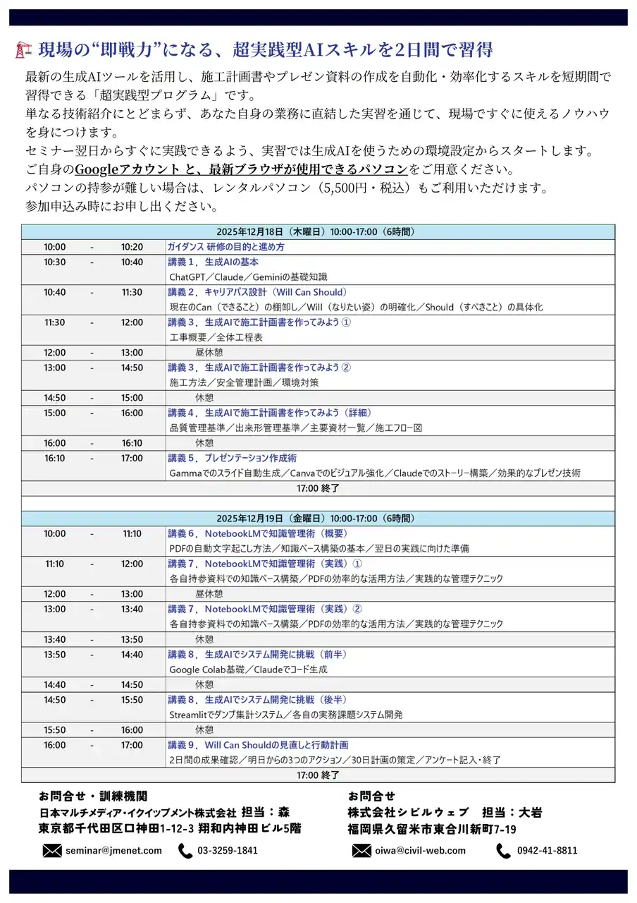 建設業界に特化した生成 AI 活用の実践セミナー 「生成 AI で施工計画書を爆速作成!建設技術者のための生成 AI 実践セミナー」が、 2025 年 12 月 18 日(木)・19 日(金)の 2 日間、福岡県博多にて開催されます。 |