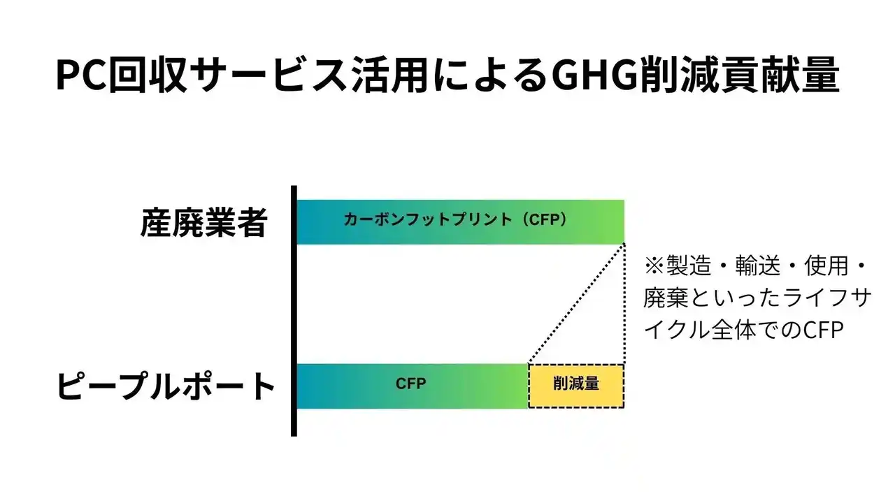 また、算定されたGHG削減貢献量のデータはピープルポートを通じて回収サービス導入企業へ提供される予定です。これにより、ユーザー企業は自社のパソコン処分によるGHG削減効果を定量的に把握し、温室効果ガス排出インベントリやESGレポート等で活用することが可能となります。従来は見えにくかった「廃棄から再利用への切り替えによる削減効果」が「見える化」されることで、企業は脱炭素経営の一環として具体的な効果を社内外に示しやすくなります。 |