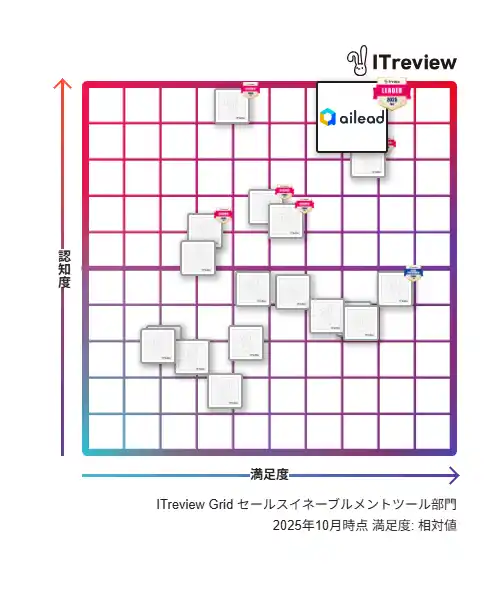 株式会社ailead(本社:東京都港区、代表取締役:杉山大幹)が提供する商談解析クラウド「ailead (エーアイリード)」は、「ITreview Grid Award 2025 Fall」のセールスイネーブルメントツール部門においてユーザーからの高評価の称号「Leader」を受賞致しました。今回で「Leader」の受賞は、セールスイネーブルメントツールとしては13期連続となります。 |