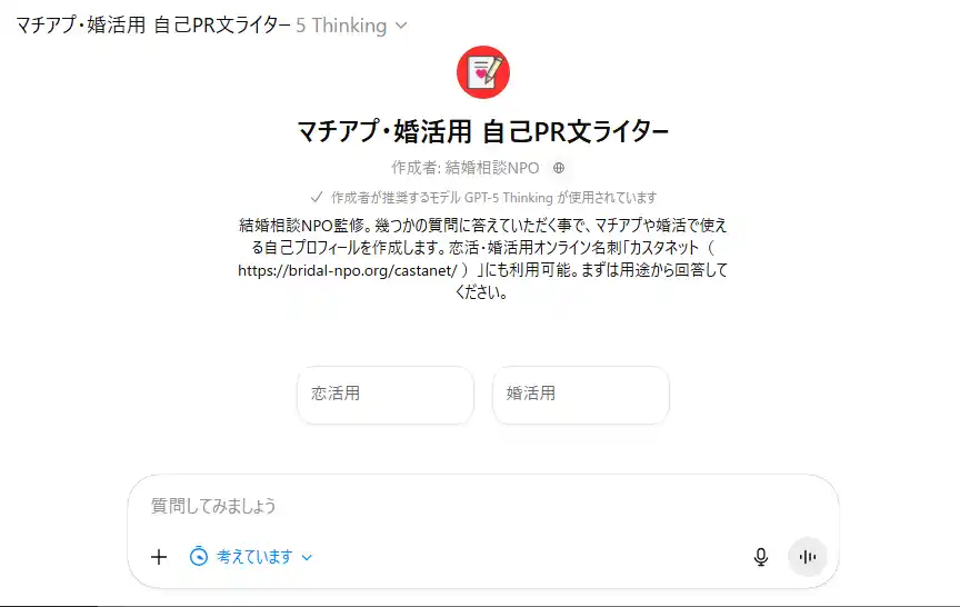 東京都認証特定⾮営利活動法人 結婚相談NPO(所在地:東京都武蔵野市)はOpenAI社の最新GPT「GPT-5」を利用したGPTs「マチアプ・婚活用 自己PR文ライター」をGPTストアにて公開致しました。