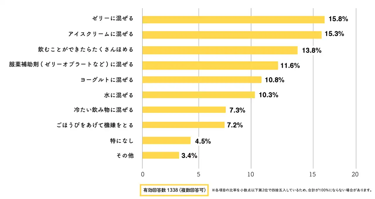 ・ゼリーなどに混ぜたが味が変わってしまい、食べきれなかった(東京都・10歳のお子さんのお母さま) |