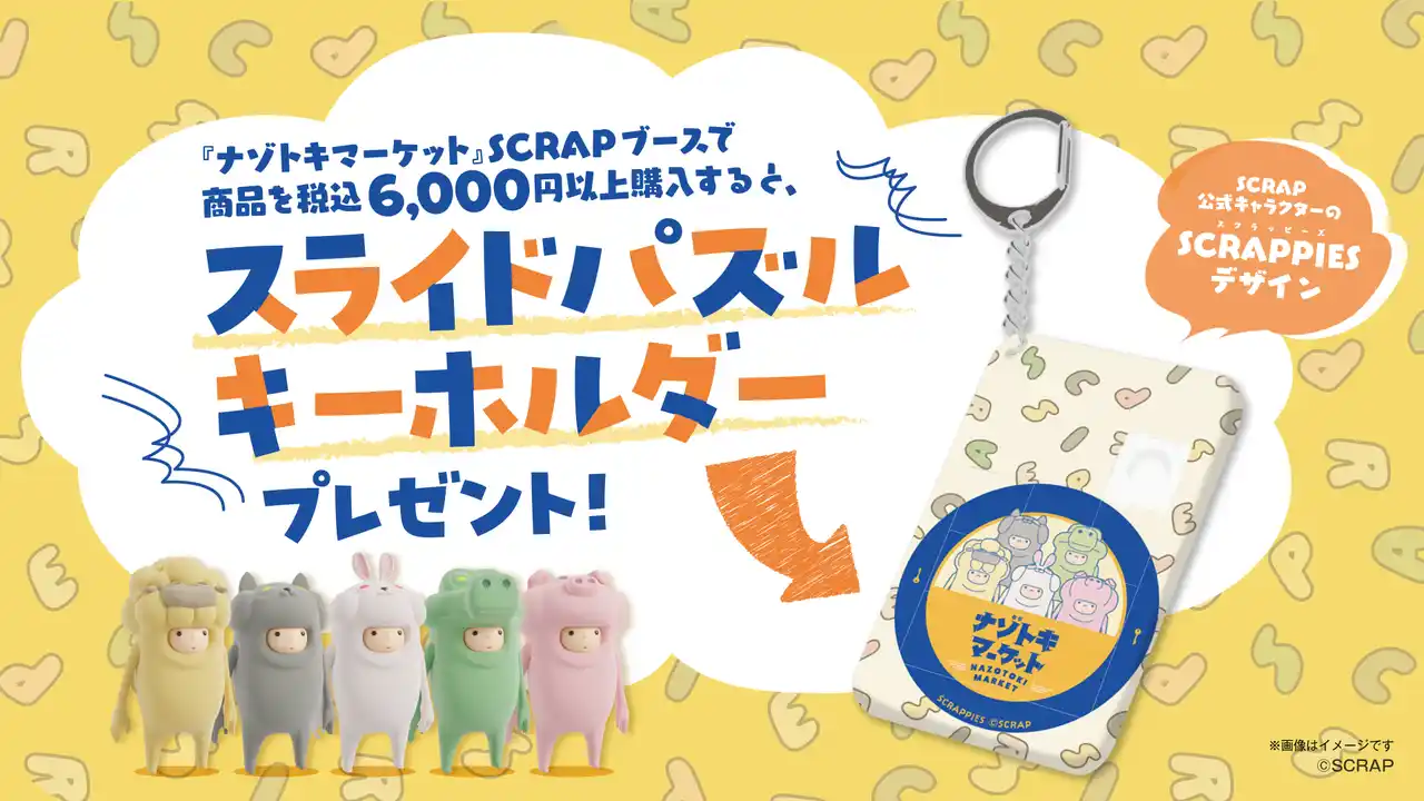一会計につき税込6,000円以上購入した方へ、SCRAP公式キャラクターであるSCRAPPIES(スクラッピーズ)がデザインされたスライドパズルキーホルダーをプレゼント。 |