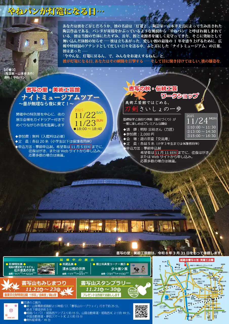 書写の里・美術工芸館では、書写山もみじまつりとあわせて、最初で最後となる「書写の里・美術工芸館ナイトミュージアム」を開催します。 |