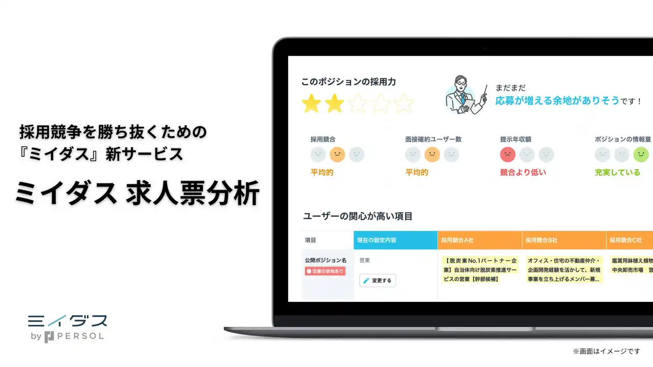 『採用競争を勝ち抜くための新サービス「ミイダス 求人票分析」イメージ画像 |