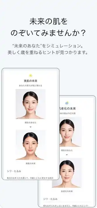 肌シミュレーション機能 スキンケアを継続した場合と行わなかった場合の未来の肌を比較表示。 ケアの重要性を直感的に理解できます。 |