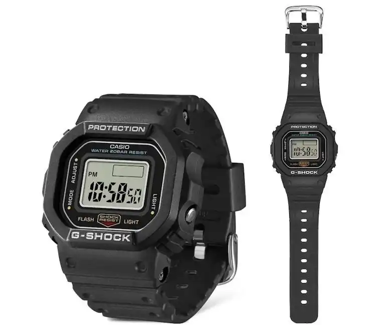 ベゼルやバンドの複雑な造形を射出成型技術によって細部まで忠実に再現したほか、ボタン、美錠、裏蓋には通常の“G-SHOCK”と同じステンレス素材を使用しました。フェイスには「5600」と同じ6桁表示のデジタル液晶を搭載しています。さらに、樹脂モデル同様バンド穴式を採用しているので、着用する指のサイズに合わせて自由に調整ができます。 |