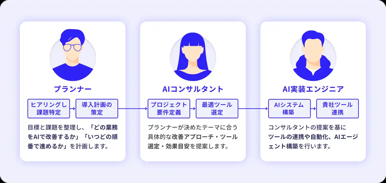 最大の特長は、“採用コストゼロ”で3名のAI専門家を即時アサインできること。 企業の状況に合わせたAI活用戦略を策定し、ツール選定から構築、定期的な改善提案までを包括的にサポートします。 |