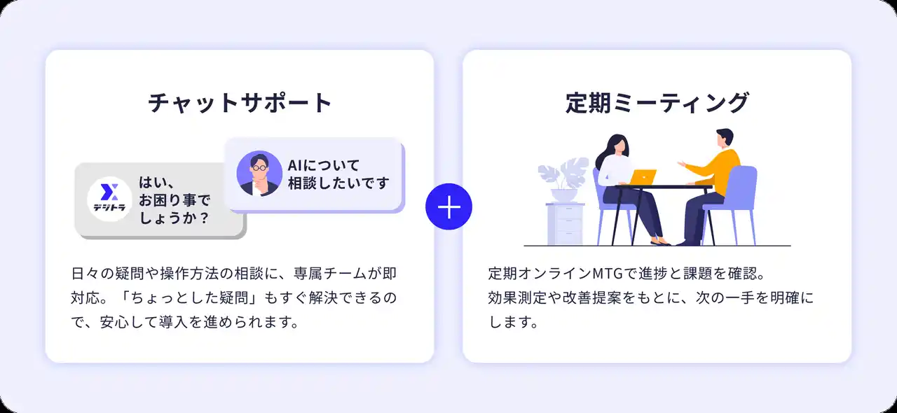 導入後も定期改善MTGで継続的に伴走し、現場へのAI定着を支援します。 |