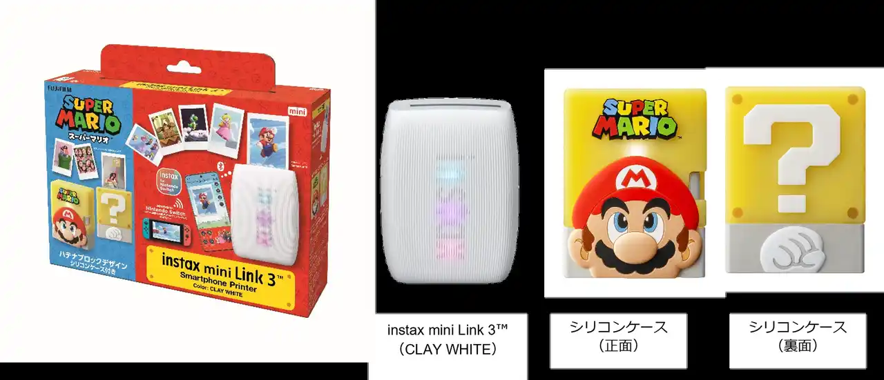 当社は、スマホプリンター「instax mini Link 3(TM)」(以下、「Link 3」)と「スーパーマリオ」のハテナブロックをデザインしたシリコンケースとのセット品を数量限定で2025年11月7日より発売します。ハテナブロックからプリントが出てくるような体験をお楽しみいただけます。 |