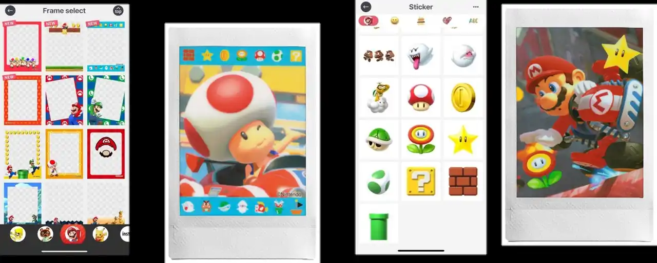 新しいデザインの「スーパーマリオ」のフレームとステッカーが登場。多彩なキャラクターのフレーム(147点)やステッカー(167点)を、撮影したゲーム画像やお気に入りの画像と組み合わせることで特別なチェキプリント(TM)を作り上げます。 |