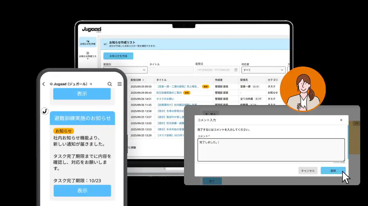 「既読」から「完了」まで、行動を可視化 配信したお知らせが誰に読まれたかはもちろん、依頼した作業が完了したかまでをリアルタイムで把握。「あの件、どうなった?」といった無駄な確認作業がなくなり、管理職も従業員も本来の業務に集中できます。 |