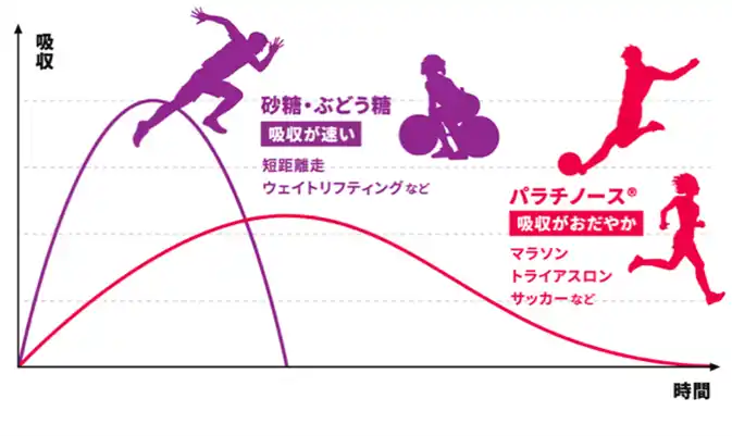 糖のトップメーカー・DM三井製糖が 40 年にわたり研究・開発する「パラチノース(R)」は、世界に先駆けて 1985 年に日本で最初に食品用途で発売された、小腸全体を使ってゆっくり吸収される性質をもつ植物(てん菜)由来の天然糖質。砂糖と同じくブドウ糖と果糖がつながった二糖類でエネルギー量も同じ(1gあたり4kcal)ですが、吸収スピードが砂糖の約5分の1という特性をもっています。その特性から、「パラチノース(R)」は持久系スポーツに適したエネルギー源といわれ、科学的な知見からアスリートのパフォーマンスアップに貢献。マラソンやトレイルランナーといった持久系スポーツ選手や、トレーニーに愛飲いただいています。 |