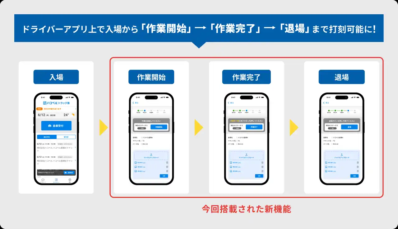 ハコベル株式会社(本社:東京都中央区、代表取締役社長CEO:狭間 健志、以下:ハコベル)は、トラック予約/受付システム「トラック簿」のドライバーアプリに「作業開始/完了打刻機能」を搭載しました。 |