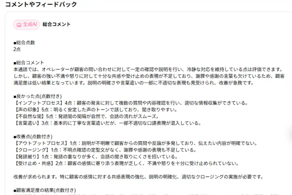 忙しい管理者でも、「誰が要指導か」「どの点を改善すべきか」を一目で把握できます。 AIによる客観的な評価とわかりやすいレポートにより、品質向上サイクルを効率化します。 |