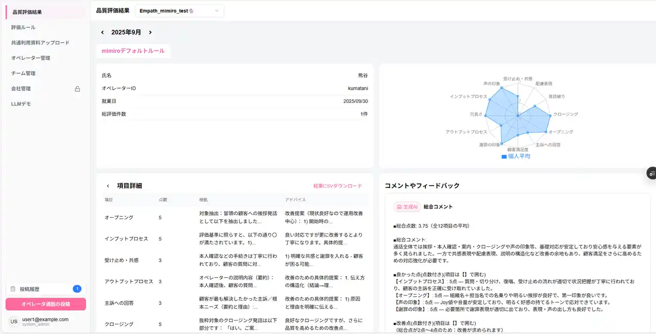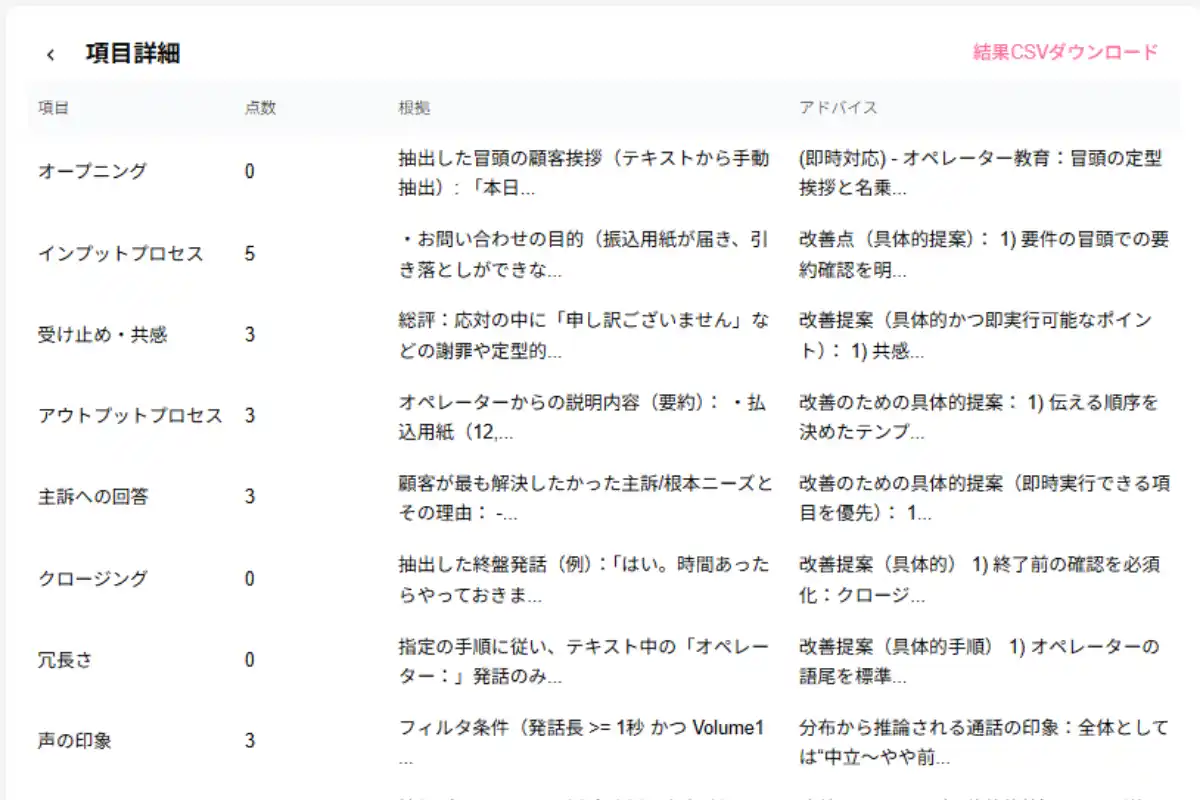 各通話を項目ごとにスコアリングし、根拠や改善アドバイスを含むレポートが自動生成されます。さらに、オペレーターごとの成績を一覧表示するダッシュボード機能も搭載。 |
