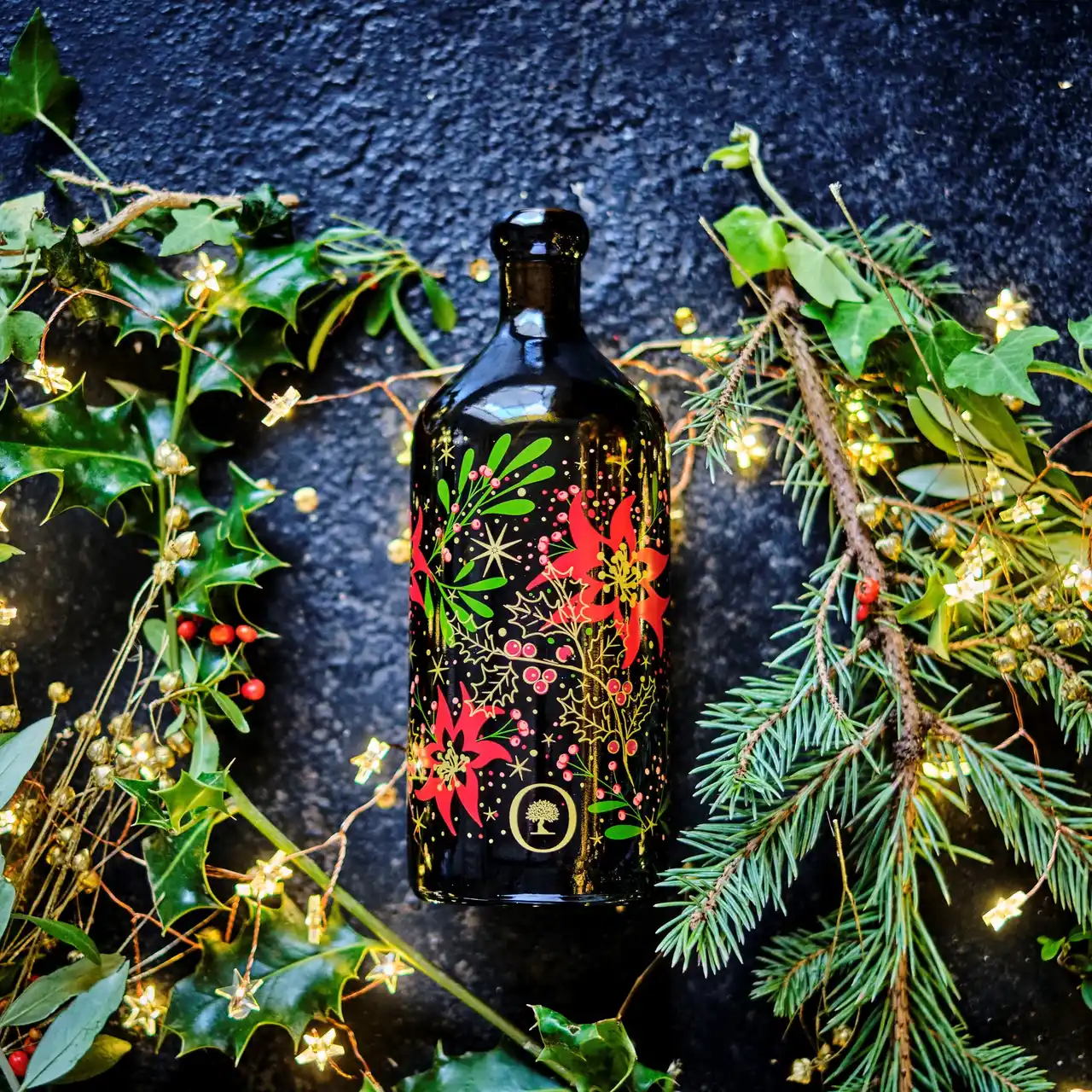 冬季限定デザインボトルは深緑、煌めく金、鮮やかな赤が織りなす植物モチーフで華やかに彩られ、テーブルに置くだけで心弾むクリスマスの雰囲気を演出します。 |
