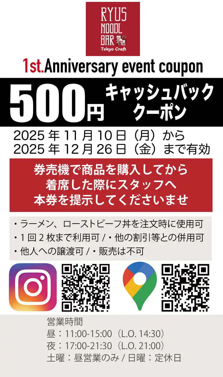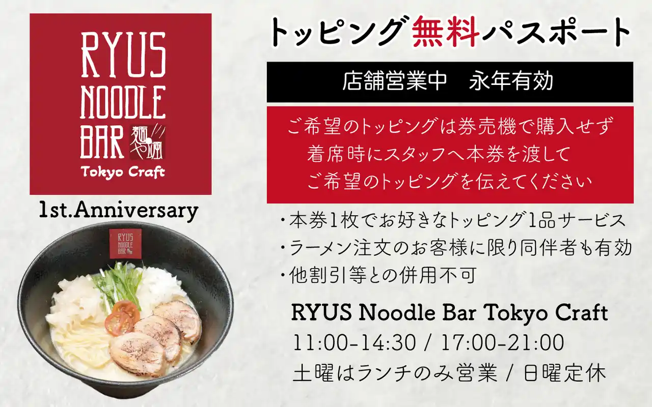 | 株式会社プライムアイ(本社:東京都中央区日本橋兜町、代表取締役:山田正太)は、この度、東京日本橋蛎殻町に出店した「RYUS Noodle Bar Tokyo Craft」がオープン1周年を迎えたため、日頃の感謝の気持ちを伝えるためにイベントを開催いたします。イベント開催日時において、ラーメン1杯注文ごとに500円キャッシュバッククーポンを配布いたします。更にイベント期間中にご来店のお客様全員へ「トッピング永年無料パスポート」を進呈いたします。 | ||||||||||||||