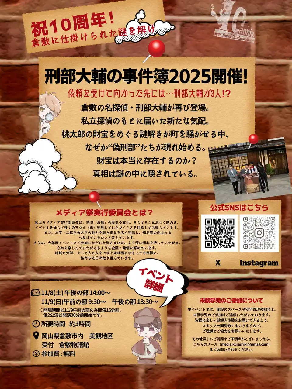 二松学舎大学メディア祭実行委員会主催の「名探偵刑部大輔の事件簿」は、参加者が物語の登場人物となり、未解決事件の真相を解き明かす体感型推理ゲームです。令和7年11月8日(土)と9日(日)に倉敷美観地区で開催され、倉敷美観地区内に隠された証言や証拠品を基に推理を進める新感覚のゲームです。物語世界と現場を行き来しながら真相に迫るこのイベントは、ミステリー作品への興味を深めてくれる絶好の機会です。推理好きの方はお見逃しなく。 |