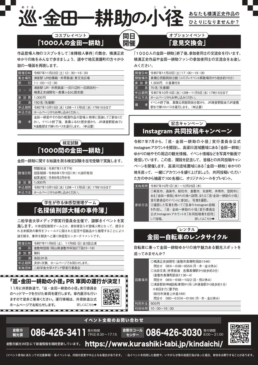 「巡・金田一耕助の小径」実行委員会は、横溝正史作品の名探偵・金田一耕助誕生の地である岡山県倉敷市真備町を中心に、令和7年度「巡・金田一耕助の小径」の秋季イベントを開催します。今年も作中の世界観を体感できるコスプレイベント「1000人の金田一耕助」をはじめ、知識を測る検定試験「1000問の金田一耕助」、学生が企画する体感型推理ゲーム「名探偵刑部大輔の事件簿」やオプションイベントなど多岐にわたるプログラムを展開。全国の横溝作品ファンが作品世界に没入し、倉敷市真備町の温かさを体感できます。 |