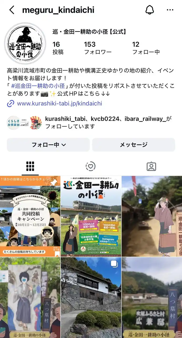 高梁川流域市町の金田一耕助や横溝正史ゆかりの地、イベント情報を発信する新たなプラットフォームとして、公式Instagramアカウントを開設しました。アカウント開設を記念し、ゆかりの地で撮影した写真に「#(ハッシュタグ)巡金田一耕助の小径」を付けて投稿する共同投稿キャンペーンを10月から実施しています。抽選で高梁川流域市町の特産品やオリジナルシールをプレゼント。 |