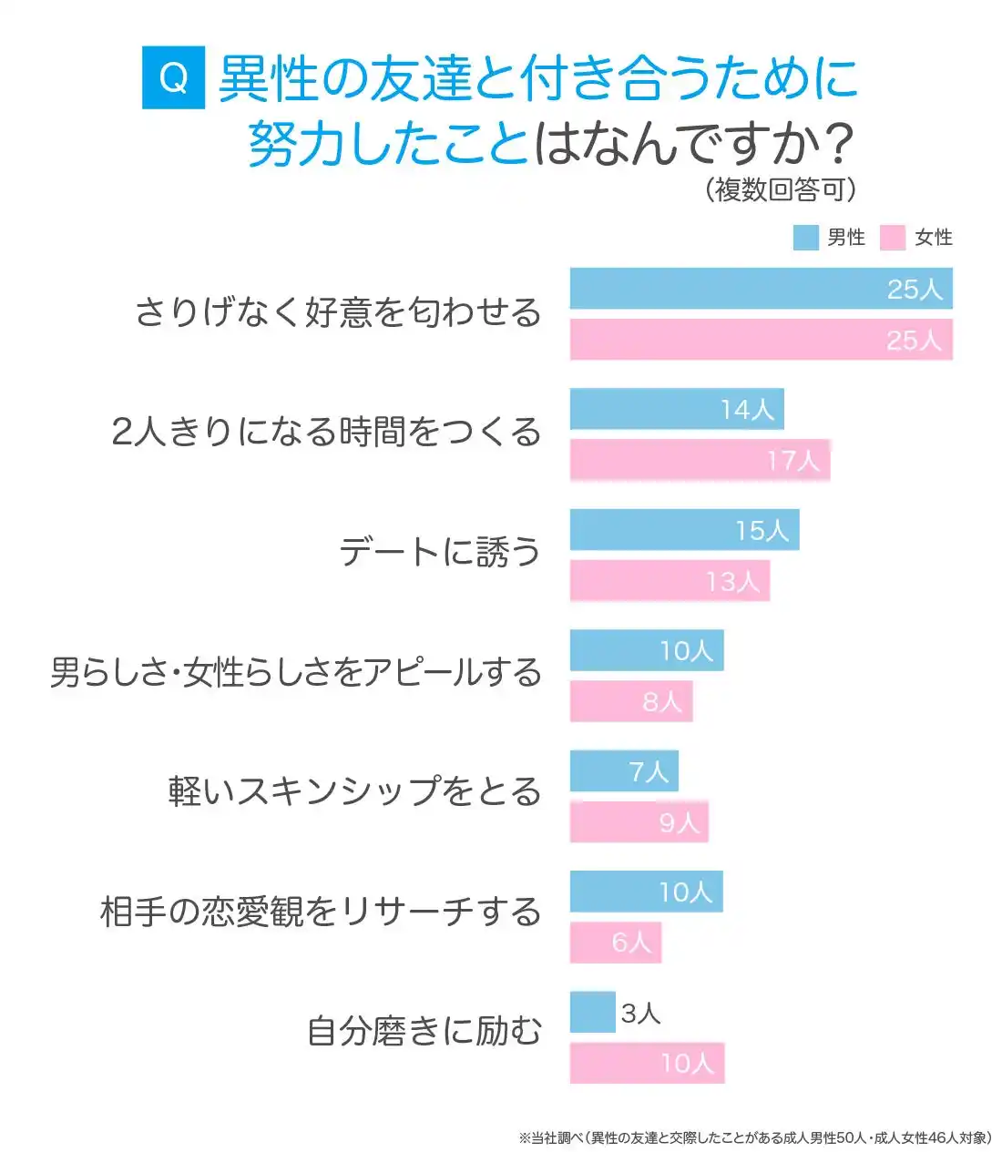 | 異性の友達と交際経験がある成人男女に、付き合うために努力したことを聞いたところ、「さりげなく好意を匂わせる」が最多回答でした。 | ||||||||||||||||