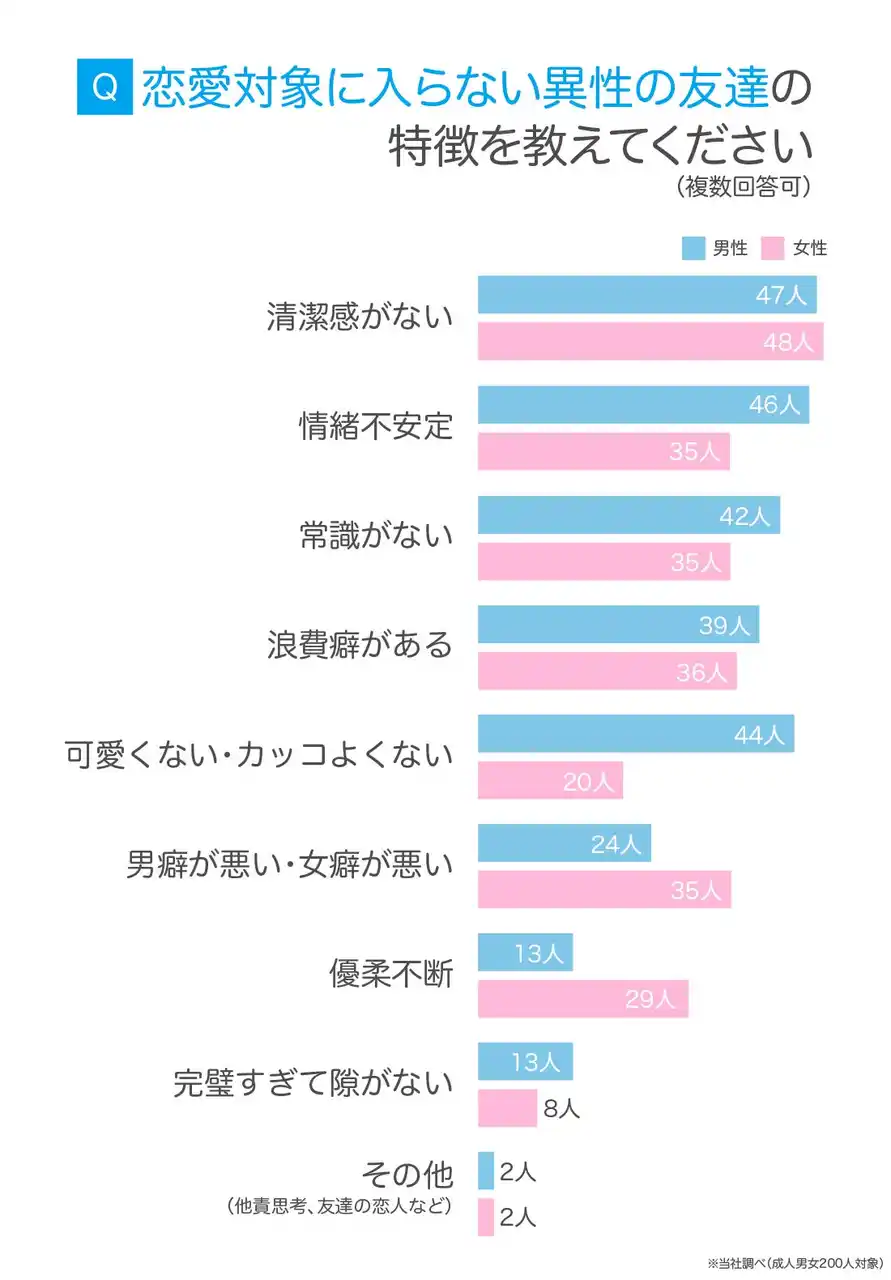 | 成人男女200人に、恋愛対象に入らない異性の友達の特徴を聞いたところ、「清潔感がない」と「情緒不安定」が上位にランクインしました。 | ||||||||||||||||