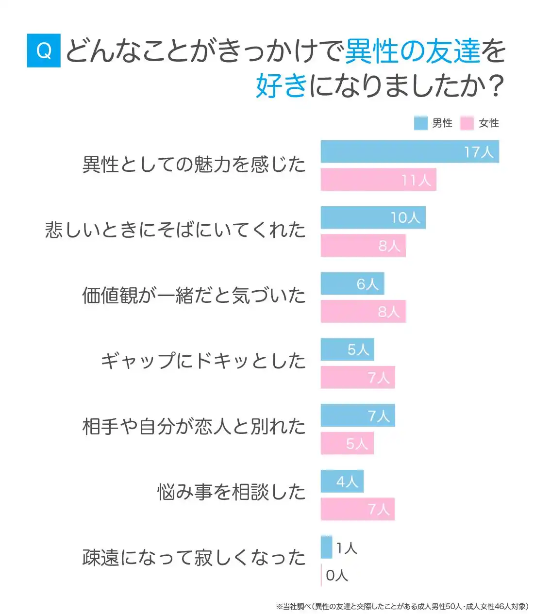 | この結果から、友達を好きになるきっかけはひとつではなく、人によってさまざまであることがわかります。 | ||||||||||||||||