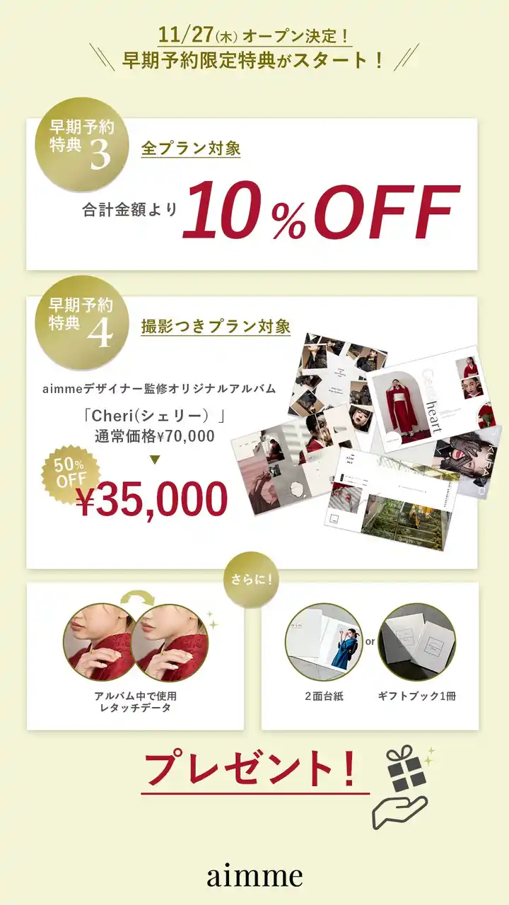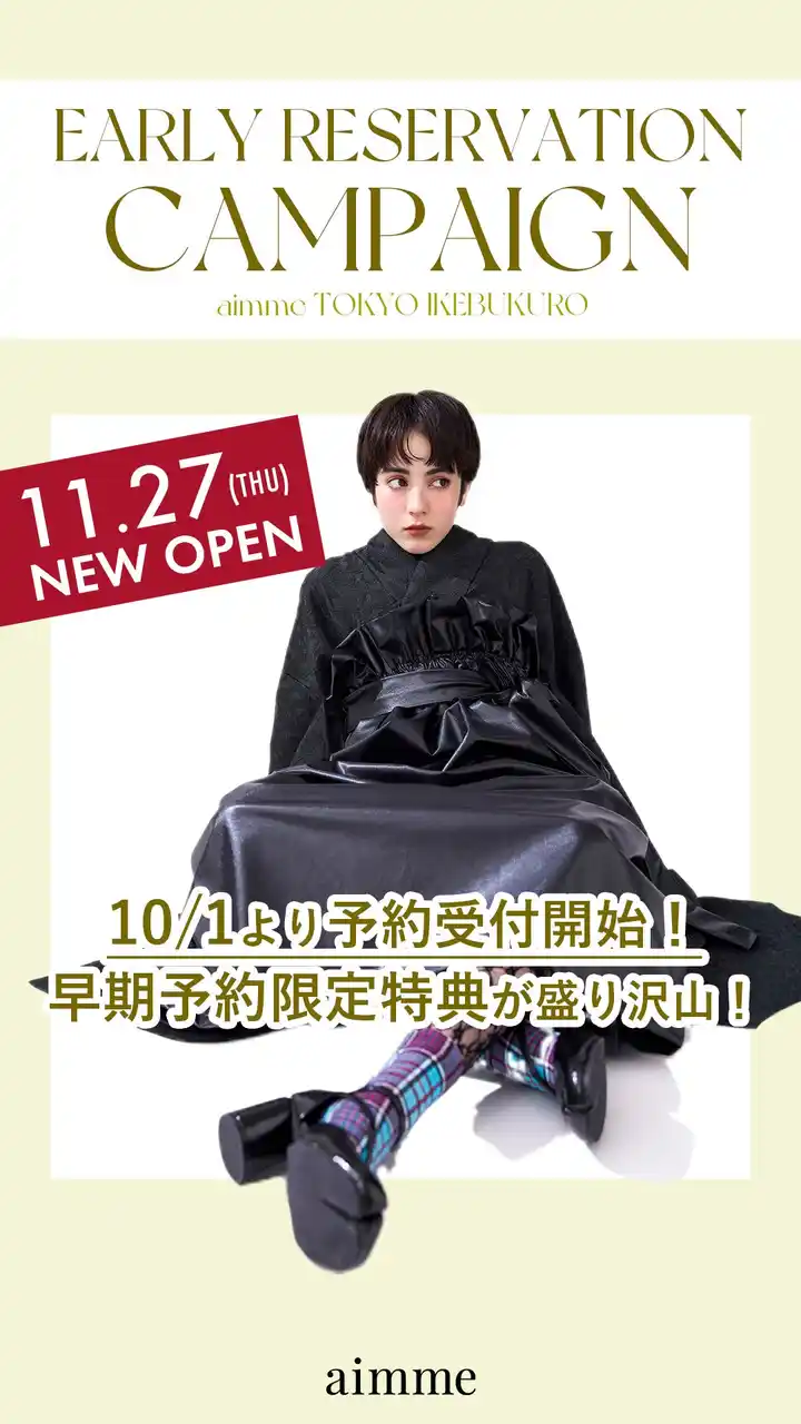 aimme東京池袋店オープンを記念し、先行予約期間中にご契約いただいたお客さまを対象とした限定特典を複数ご用意しております。 |