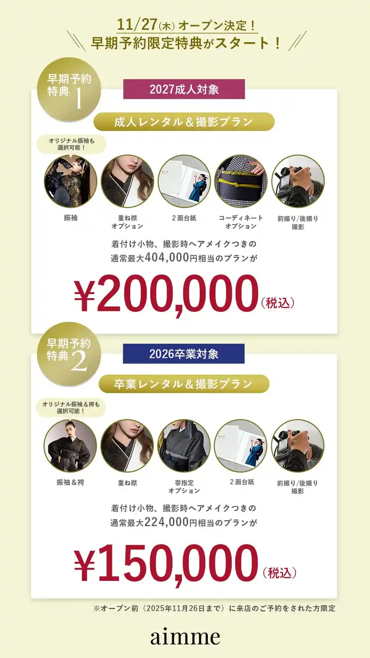 有限会社三景スタジオ(本社:北海道旭川市、代表取締役:大西康弘)は、当社が展開する振袖・卒業袴ブランド「aimme(エイミー)」の新店舗を、2025年11月27日(木)に東京・池袋(南池袋1-21-4 8F)にオープンいたします。 |
