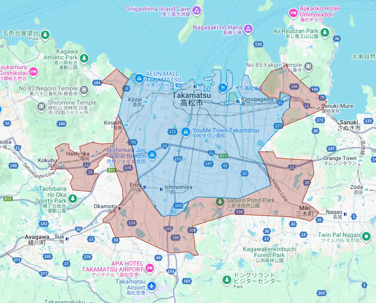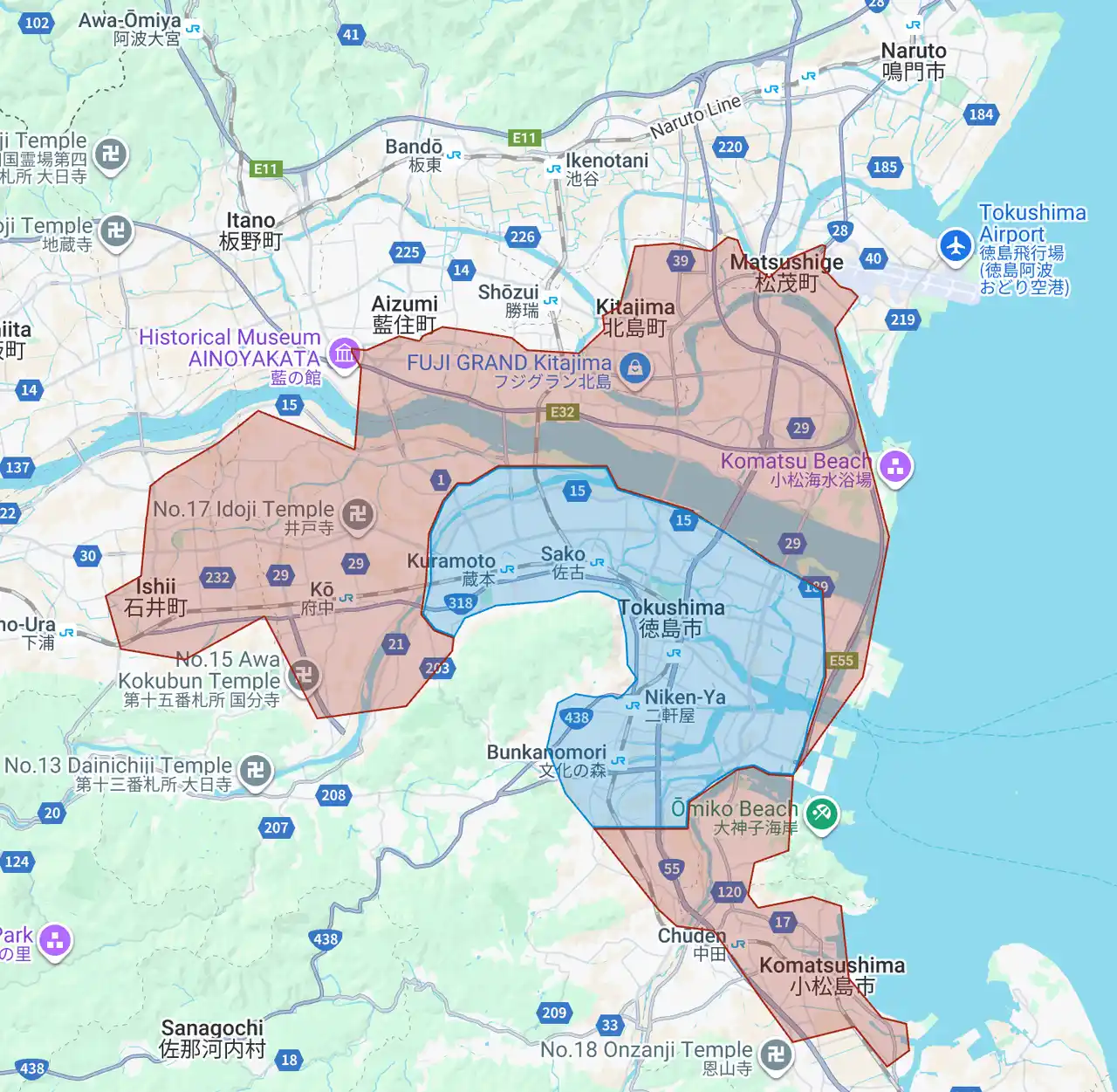 徳島県:徳島市(石井町、北島町、松茂町、藍住町の一部エリア含む)、小松島市 |