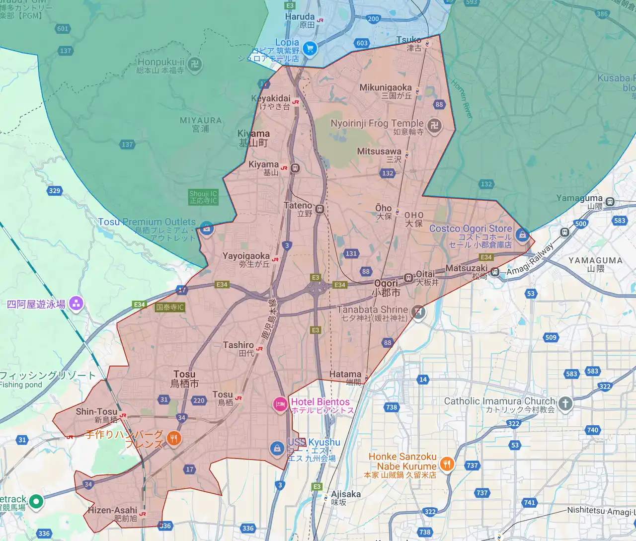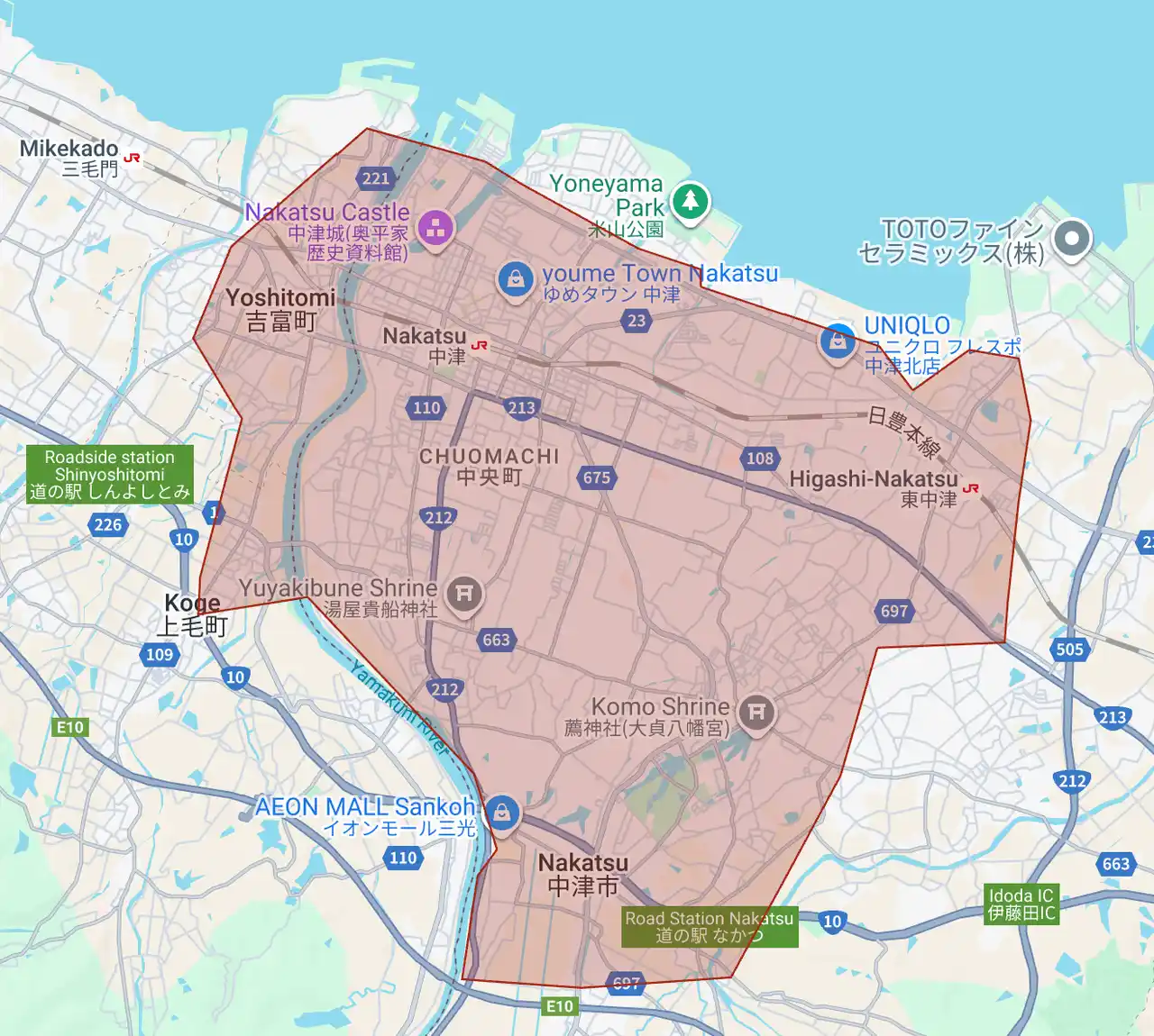 大分県:中津市(福岡県吉富町・上毛町の一部エリア含む)、日田市 |