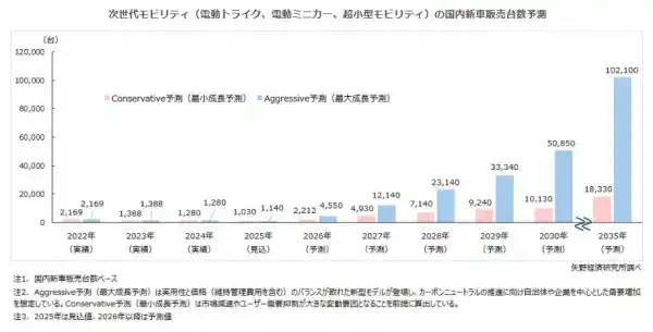 なお、Aggressive予測(最大成長予測)は実用性と価格(維持管理費用を含む)のバランスが取れた新型モデルが登場し、カーボンニュートラルの推進に向け自治体や企業を中心とした需要増加を想定している。Conservative予測(最小成長予測)では市場減速やユーザー需要抑制が大きな変動要因となることを前提に算出している。