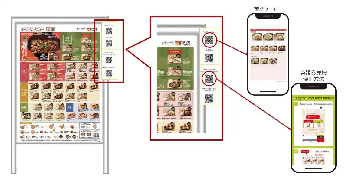 店頭や店内に掲出したQRコードをお客様自身のスマートフォンで読み取っていただくことで、英語と中国語(簡体字)で表記したメニューや券売機、テーブルトップオーダーでの商品購入方法をスマートフォンで確認することが出来ます。 | ||||||||