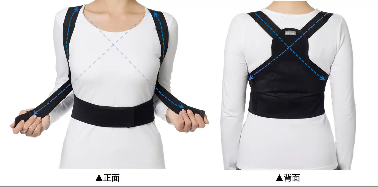 従来の姿勢補整アイテムでは、肩にかかるベルトが脇を圧迫したり、補整力が伝わりにくいといった課題がありました。「メディエイドスタイルケア 背中ストレッチ」では、肩ベルトの配置を工夫し、脇に当たりにくく、肩を後方へ引く力が効率的に働く構造を採用。さらに、部位ごとに伸び方の異なる素材を組み合わせることで、身体へのフィット性と補整力との両立を実現しました。 | ||||||||||||