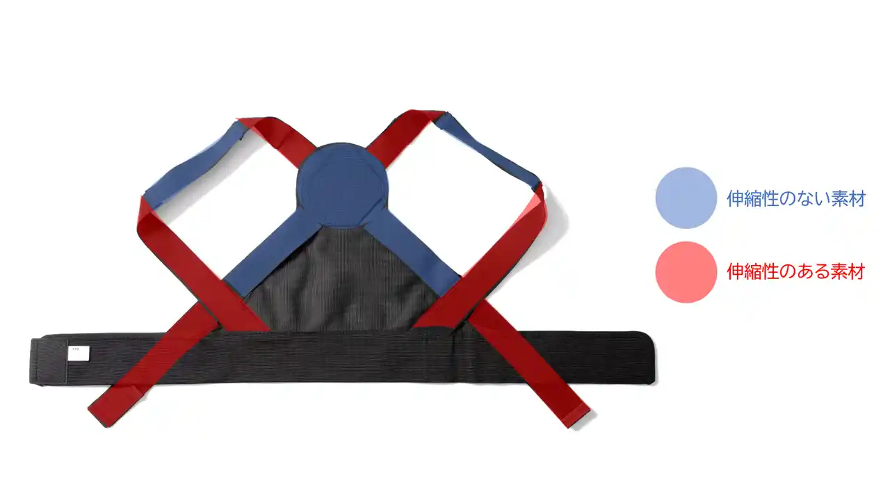 ショルダーストラップの肩の上側や背中の交差する部分など、力をかけたい部分には伸縮性のない素材を、それ以外の部分には伸縮性のある素材を使用しています。これにより、体の動きにフィットしやすく、肩を後方へ引く力をしっかり伝える設計となっています。 | ||||||||||||