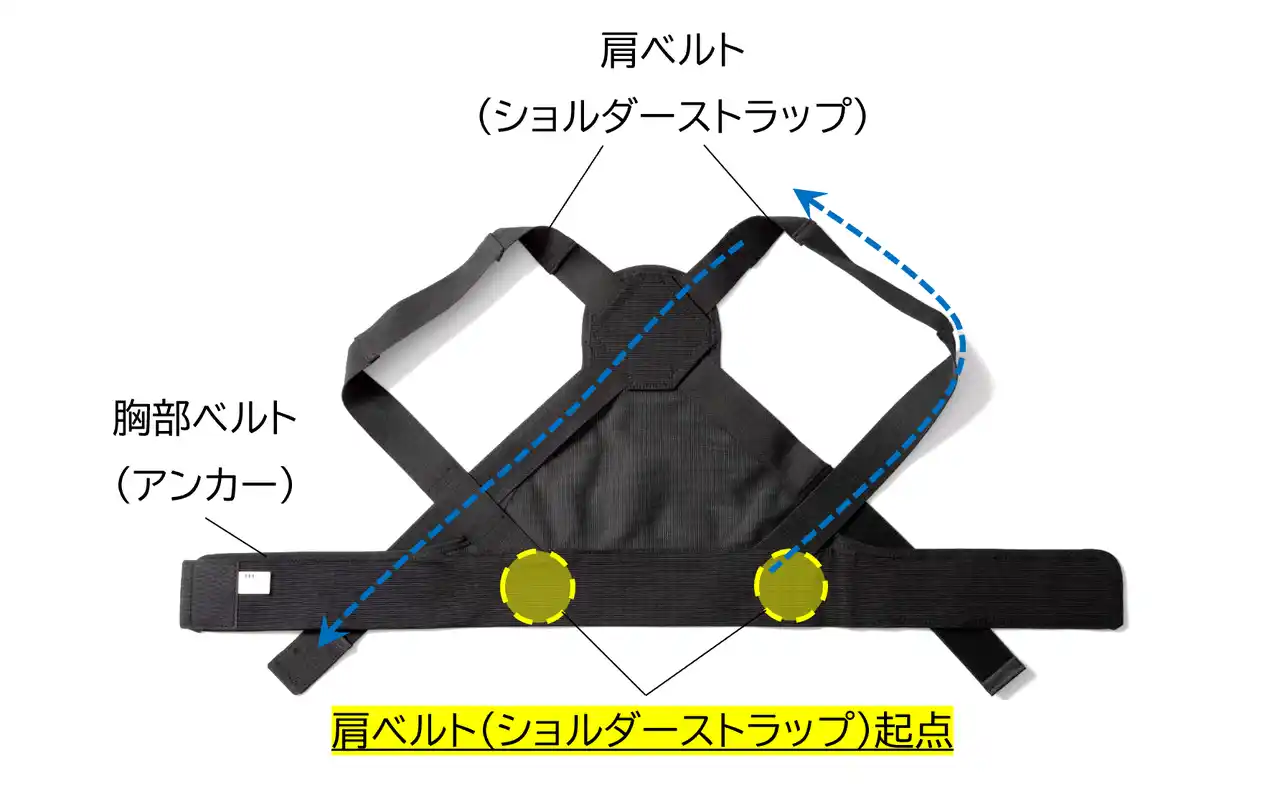 肩ベルト(以下、ショルダーストラップ)は、胸部ベルト(以下、アンカー)の体側部と背部中心の間を起点とし、肩の前側から背中へ向かい、背中で交差します。そして、反対側の体側部から前面に戻り、体の前側で止める構造になっています。 | ||||||||||||