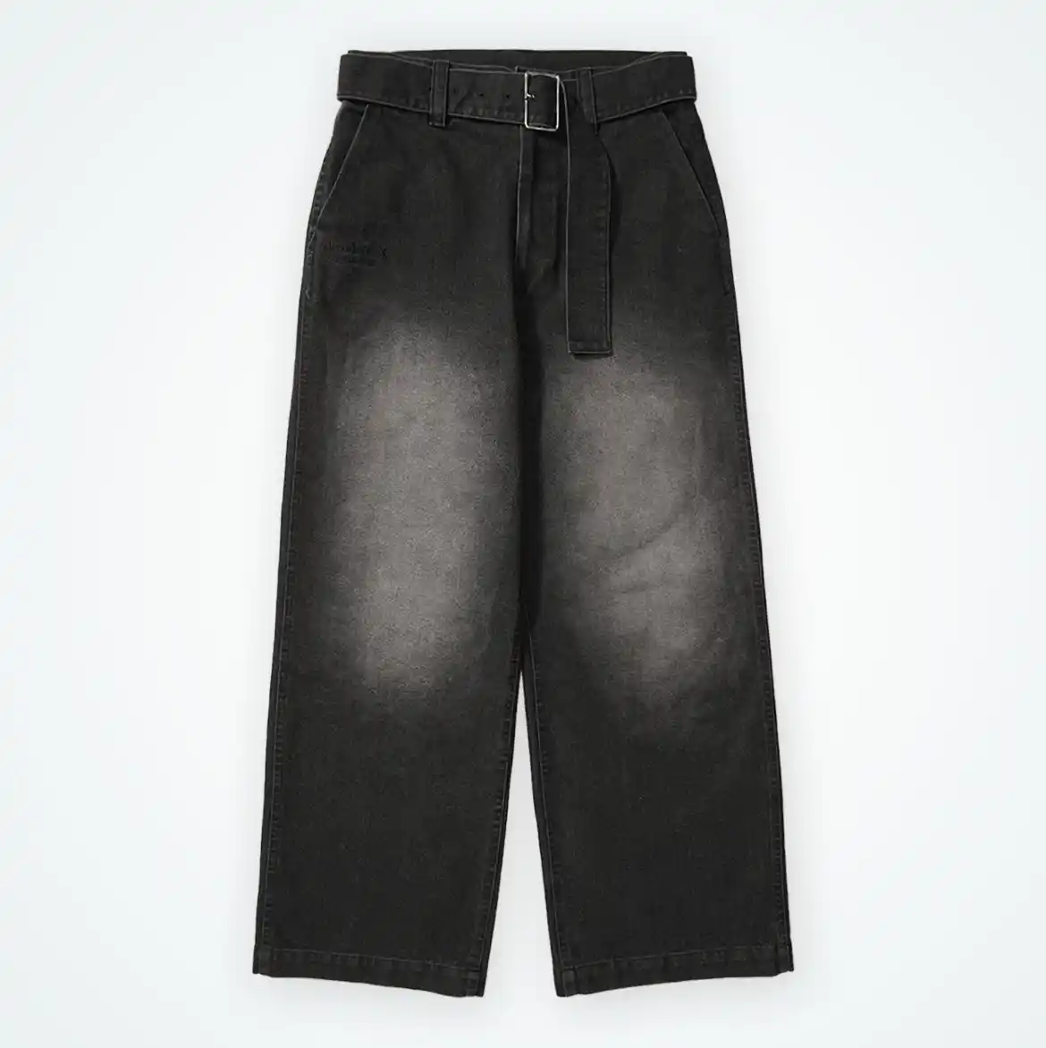 ウォッシュ加工を施し、太もも部分をフェードしたブラックデニム。右フロントのポケット部分にはブランドロゴを同系色で刺繍し、バックのウエスト部分にはレザーパッチを施しています。ゆったりとしたワイドシルエットはトレンド感があり、様々なトップスと合わせやすいデザイン。 |