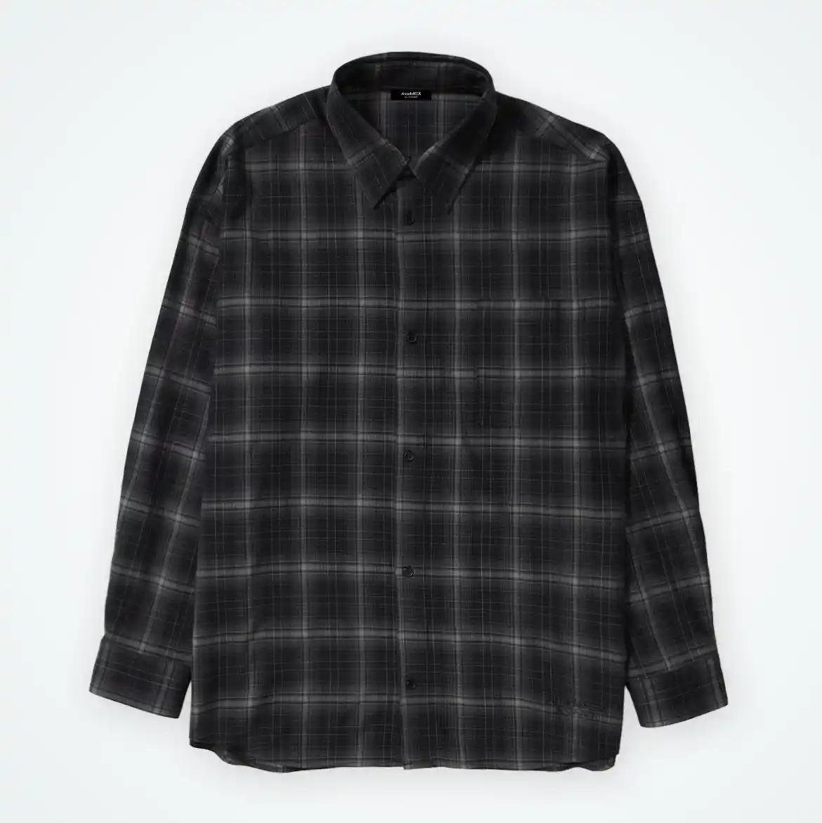 落ち着いたダークトーンが特徴のオンブレチェックシャツ。左裾にはブランドロゴをシャツと同系色で刺繍しました。オーバーシルエットで、一枚で着用しても雰囲気のあるデザインになっています。 |