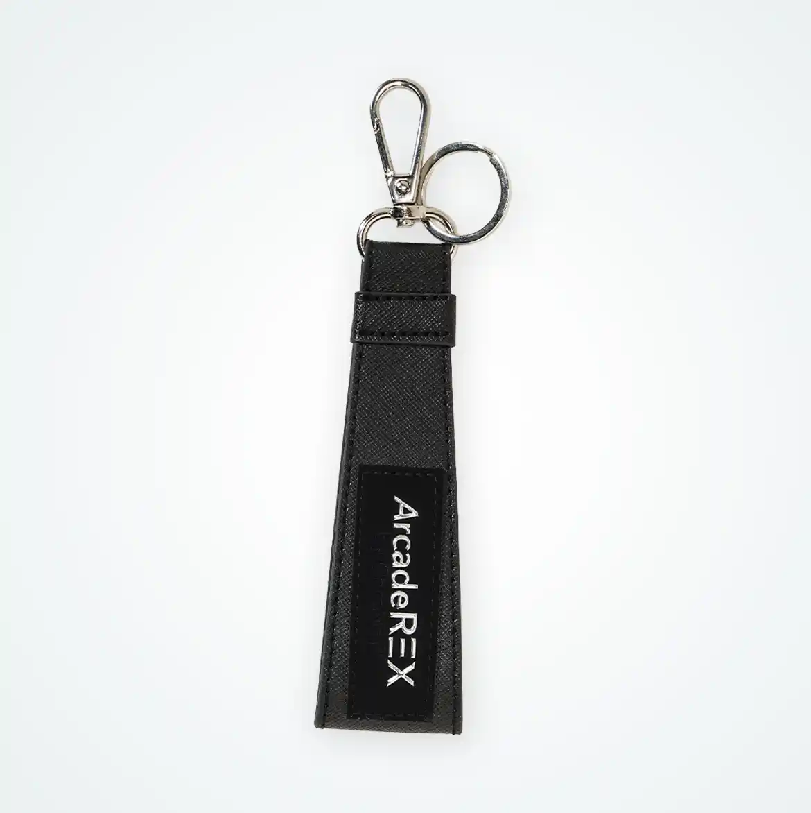 合皮レザーのボックスロゴキーリング。ブランドロゴのパッチが特徴的なデザインで、バッグやベルトループに付けて、コーディネートのアクセントとして使用可能。 |